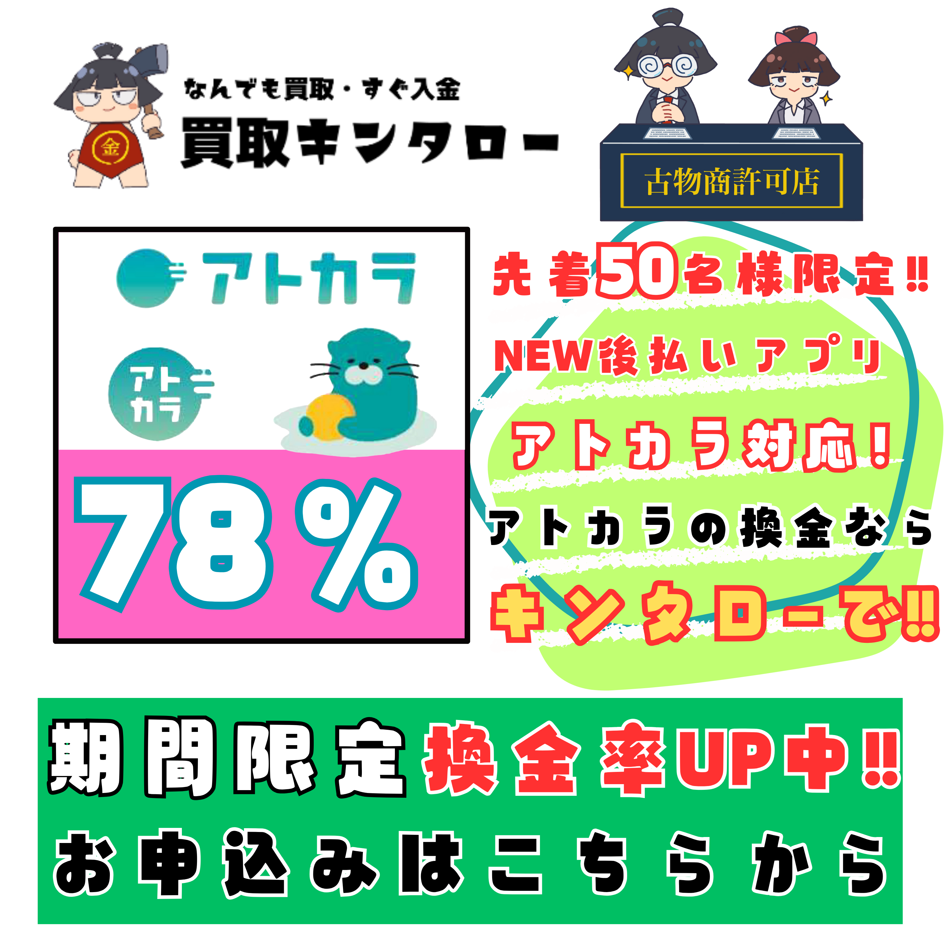 | 2024/07/20 | アトカラ買取強化を行っております! 買取キンタローでは只今アトカラの買取強化中! 換金率は78%! この機会をお見逃し無く! |